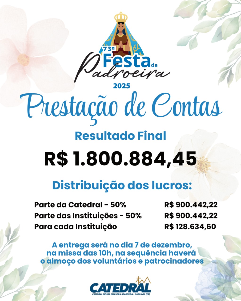 A 73ª Festa da Padroeira arrecadou R$ 1,8 milhão, sendo metade do valor destinada a sete instituições beneficentes. O evento contou com a participação de mais de 2 mil voluntários.